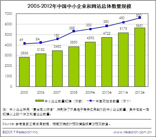 中小企业数量:2006年中国中小企业总数为3151.8万家,在国家制度环境逐步改善、宏观经济环境发展良好、中国成为全球制造业中心等诸多有利因素的推动下,艾瑞预计未来5年中国中小企业将连续扩张,中小企业数量将保持7%-8%的年增长率,2012年中小企业总数将达到5000万家。