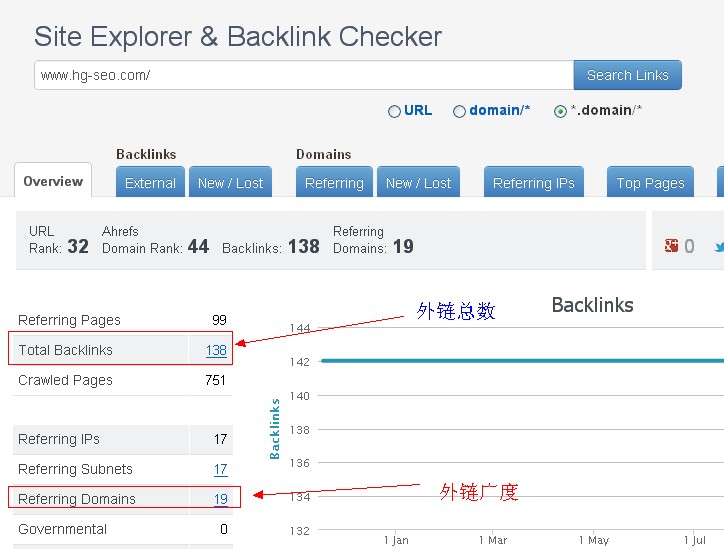 通过上图,我们可以看出这个竞争对手的外链广度有多少,外链总数有多少。假如外链总数少,广度也少的话。那么说明这个竞争对手的外链资源相对比较好点。当然了,站点好的排名还有很多的因素存在的,不单是有外链来决定。