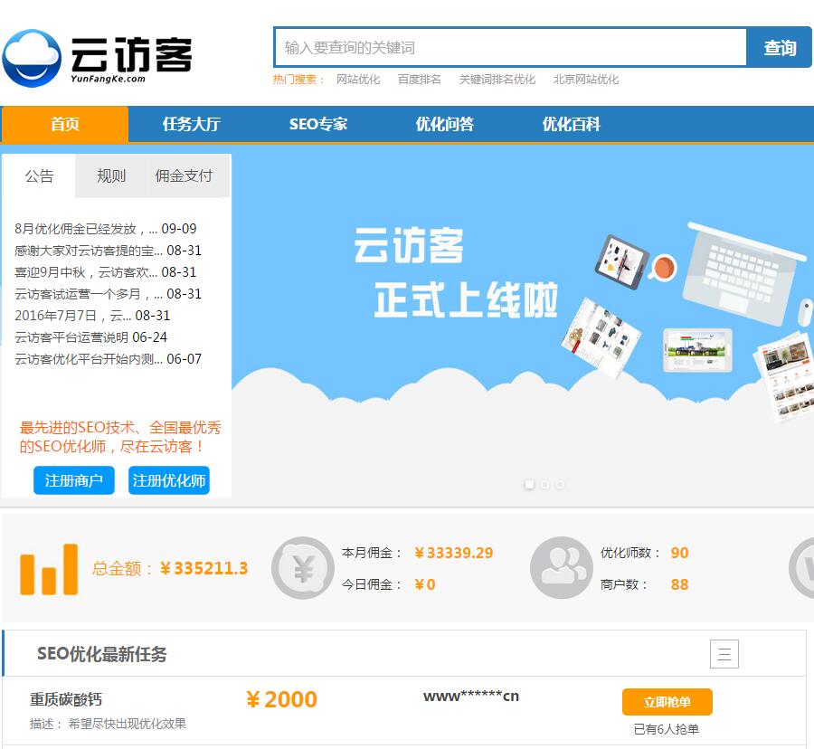 云访客从事网站优化SEO多年,有着良好的口碑跟信誉,对百度的算法有着深入的研究与了解,对百度算法的更新,能及时跟进与掌握!跟全国众多的网络优化公司有着深入的合作。云访客汇聚众多网站优化精英,为您提供百度快照优化支持,发布一个任务,可以在多少优化师中筛选出一个最出色的,帮您在最短的时间内达到你的期望目标。云访客优化师有着等级的区别,级别越高,代表优化能力越强,上万优化师任你选择。先上词后扣费,有着详细的操作日志与记录。 让你的消费清清楚楚,明明白白! 无效可随时退款!当天到账,绝不拖延!
