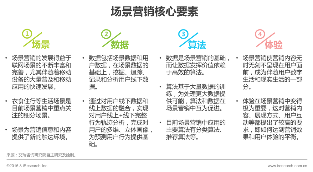 场景营销是指基于对用户数据的挖掘、追踪和分析,在由时间、地点、用户和关系构成的特定场景下,连接用户线上和线下行为,理解并判断用户情感、态度和需求,为用户提供实时、定向、创意的信息和内容服务,通过与用户的互动沟通,树立品牌形象或提升转化率,实现精准营销的营销行为。