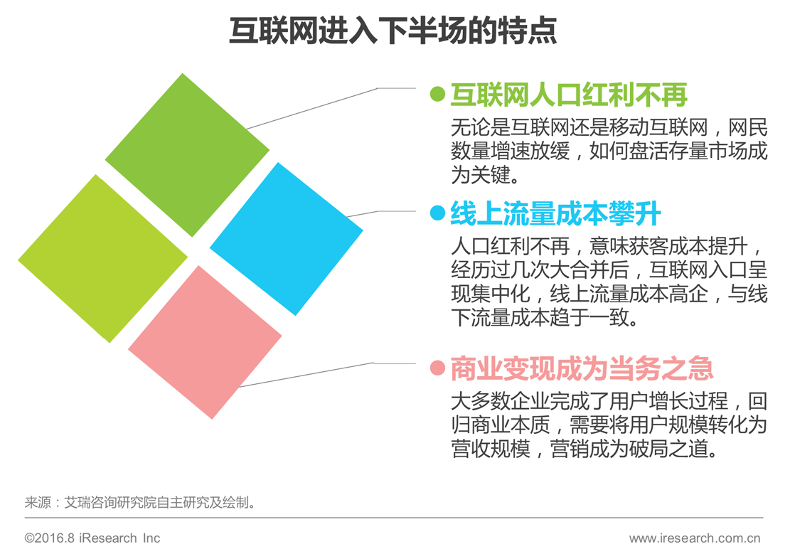 自2014年起,资本驱动中国互联网企业进行了疯狂的补贴大战,伴随而来的是细分行业内的合并浪潮,资本在经历投、管两个过程后,集中迎来退出阶段。资本对亏损的承受力越来越低,依赖资本输血的业务,再难获得资本的持续投入,企业自身造血能力越来越重要。与此同时,互联网和移动互联网人口红利不再,互联网流量的基本面发生变化,线上和线下的流量成本趋于一致,整个行业亟待挖掘新的流量。