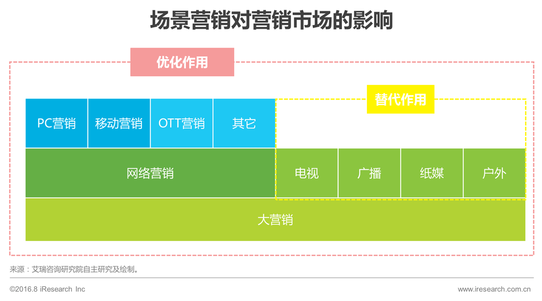 从网络营销来看,场景营销更多的是优化作用,1)对PC营销而言,部分PC营销伴随着IP地址库的完善和跨屏技术的发展也将具有场景特色;2)对移动营销而言,未来大部分移动营销都将是场景营销;3)对未来的OTT营销而言,场景营销将是OTT营销的催化剂。
