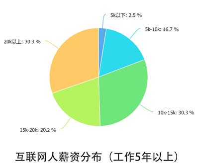 但令人欣慰的是,随着工作年限的增加,互联网人的薪资大幅提高,工龄超过5岁的互联网人平均薪资15k。
