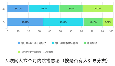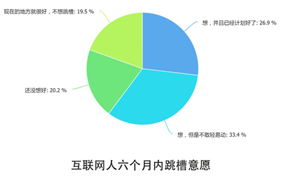 互联网人员流动快,一年一跳几乎成为常态。在调查中,超过六成的互联网人有在近六个月中跳槽的打算。只不过,其中一大半处于“想跳槽,而又不敢轻举妄动”的状态,只有27%的互联网人已经为跳槽大计做好了准备,并打算付诸实施。