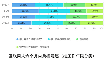 什么时候跳?工作1年以下的互联网人一般还没想好究竟是跳槽还是不跳,而工作1-3年的互联网人跳槽意愿最高。