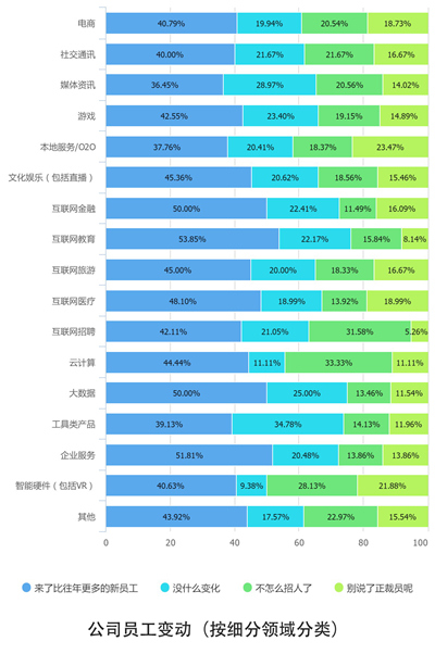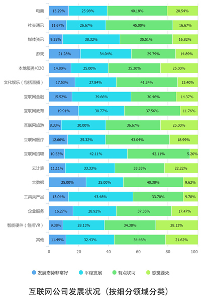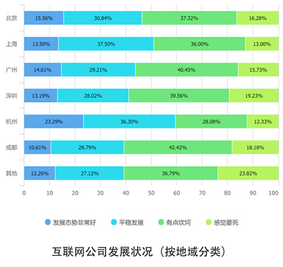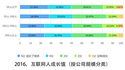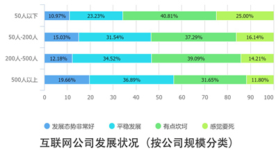 从总体观感来看,随着“互联网下半场”的到来,50人以下的初创型互联网公司由于规模小、抗压能力强,最自感生存日益艰难。而50-200人的中型互联网公司,具备了一定的抗压能力和发展势能,则自我感觉较为良好。