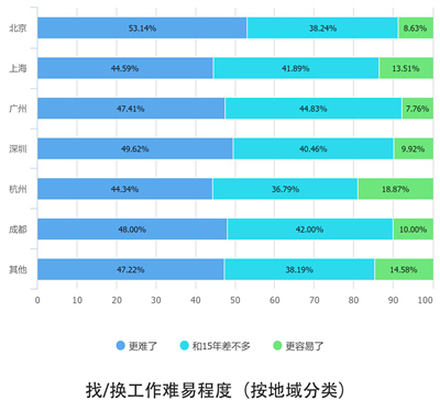 在今年找工作/换工作的难易程度上,也是杭州互联网人态度最乐观,北京互联网人态度最悲观。