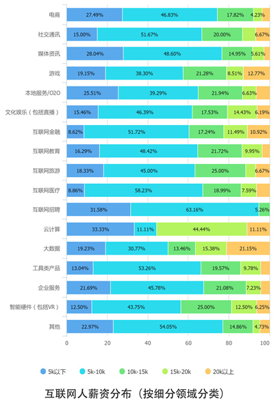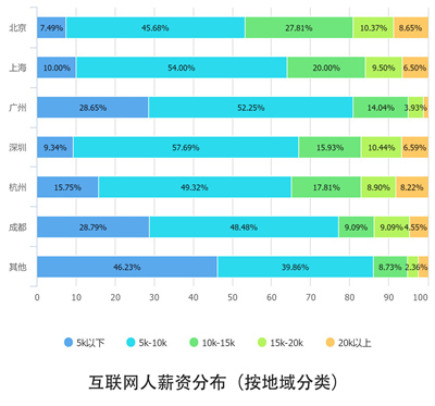 从总体来看,互联网人薪酬的中位数落在5k到10k这个范围内。只有14%的互联网人拿到了超过15k的高薪,依然有20%的互联网人月薪不到5k。