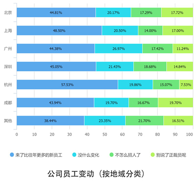 57%的杭州互联网人表示公司正在招募更多的新员工,是各个城市中最高的。