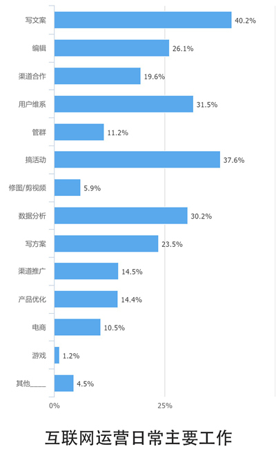 同样从上图中可以看到,数据分析在运营工作中的重要性日益明显。超过30%的互联网运营将数据分析纳入自己的日常主要工作内容中来。能文(写文案)能理(数据分析),两手抓两手都硬,这才是一个新时代的好运营。
