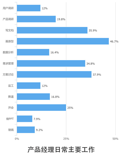 哈哈,开玩笑的啦。虽然产品经理常常被认为是一个关于宏观思考和大方向把控的“玄学”,然而落到日常工作中,产品经理的日常工作还是以大量重复的技术性工作为主。一个典型的产品经理的日常主要工作包括:画原型(46.7%的产品经理选择了此项,下同),讨论方案(37.9%),写文档(35.9%),以及管理需求(34.8%)。