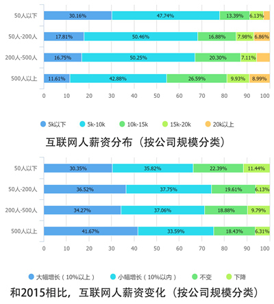 从薪资来看,50人以下的小公司工资最低,加薪比例也最低;而50人-200人的中型公司舍得高薪招人,也舍得给老员工加薪。