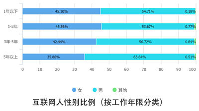 如果我们把从业年限也纳入考量的话,我们会发现,在互联网扎根多年的老手中性别不均衡的情况更加明显。而近三年刚刚入行的互联网新人则性别比例较为平均。我们很高兴看到更多女性加入互联网行业的大军。