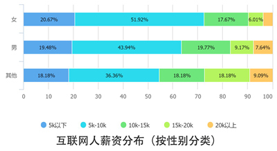 从薪资上来看,女性互联网从业者的薪资也明显低于男性。